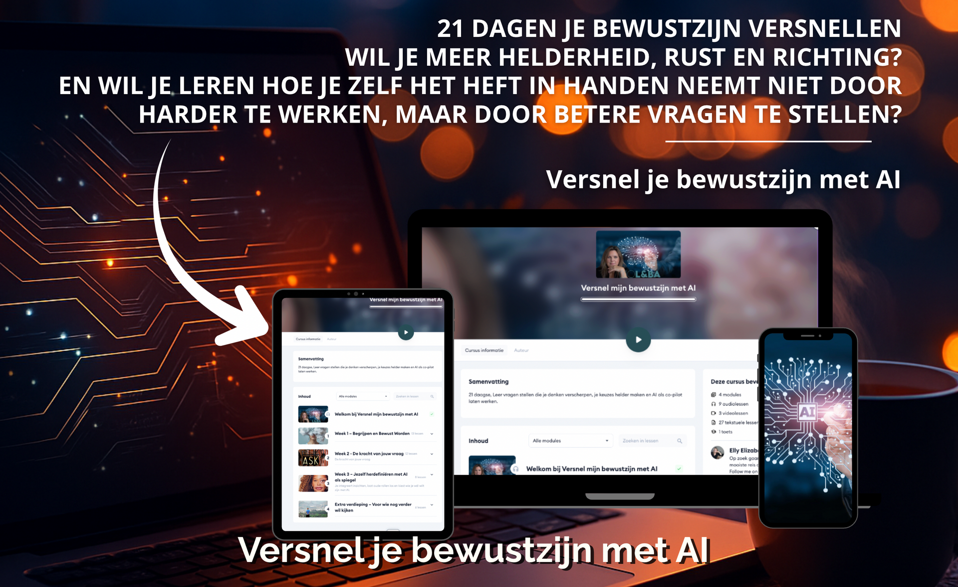 Dan is dit programma voor jou. In 21 dagen leer je hoe je bewust samenwerkt met AI, je denkpatronen doorziet en je persoonlijke groei versnelt — op een manier die natuurlijk, helder en menselijk voelt.